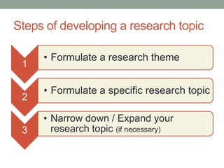 Identifying potential ideas, choosing ideas to explore further, choosing and narrowing a topic,. The first step to research is developing a topic that is not too broad or narrow in scope. What do you do with the research topic?